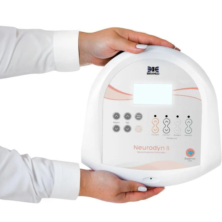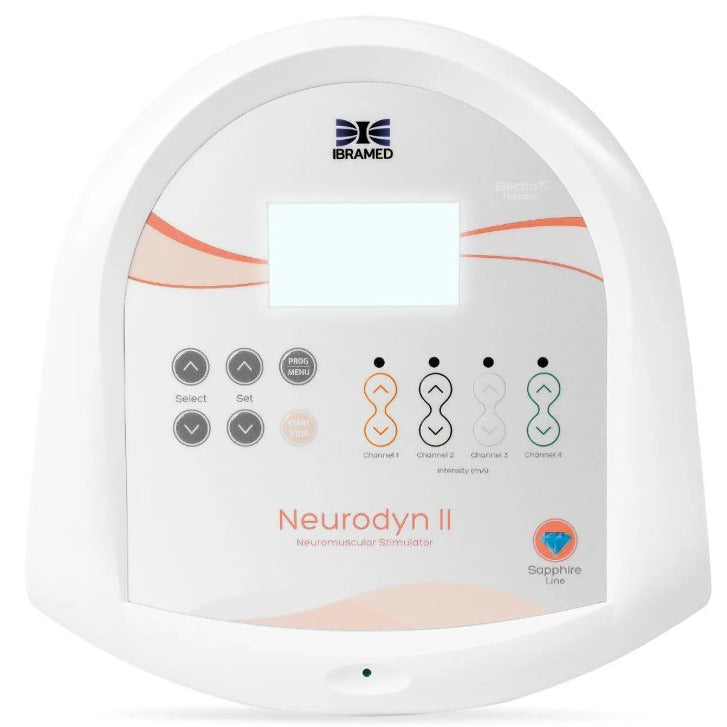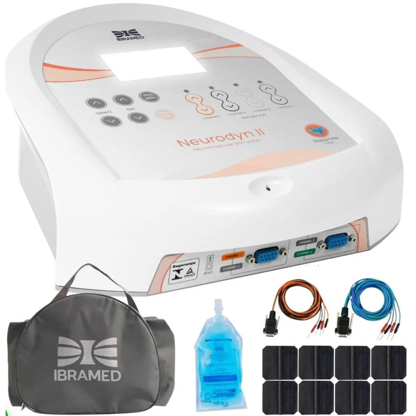 O Neurodyn II é um equipamento para aplicação de corrente elétrica via eletrodos em contato direto com o paciente para terapia de disfunções neuromusculares com as correntes TENS, FES e Russa. O eletroestimulador possui quatro canais com ajuste de intensidade independentes. Possibilita a escolha de T (duração do pulso) de 50 us a 500 us e de R (frequência de repetição dos pulsos) de 0,5 Hz a 250 Hz. A seleção destes parâmetros (T e R) é feita via teclado de toque com as informações mostradas em display de cristal líquido. Intensidade máxima de 250 mA em todos os canais.