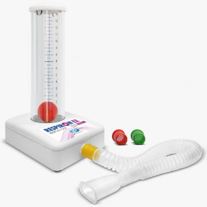 O exercitador respiratório Respiron EX (Resp In Out) foi desenvolvido visando o fortalecimento da musculatura inspiratória e expiratória, estimulando a inspiração e expiração profunda, para melhora de ventilação alveolar e higiene brônquica. Indicado no tratamento e prevenção de problemas pulmonares como atelectasias, fibroses pulmonares, pré e pós operatórios.